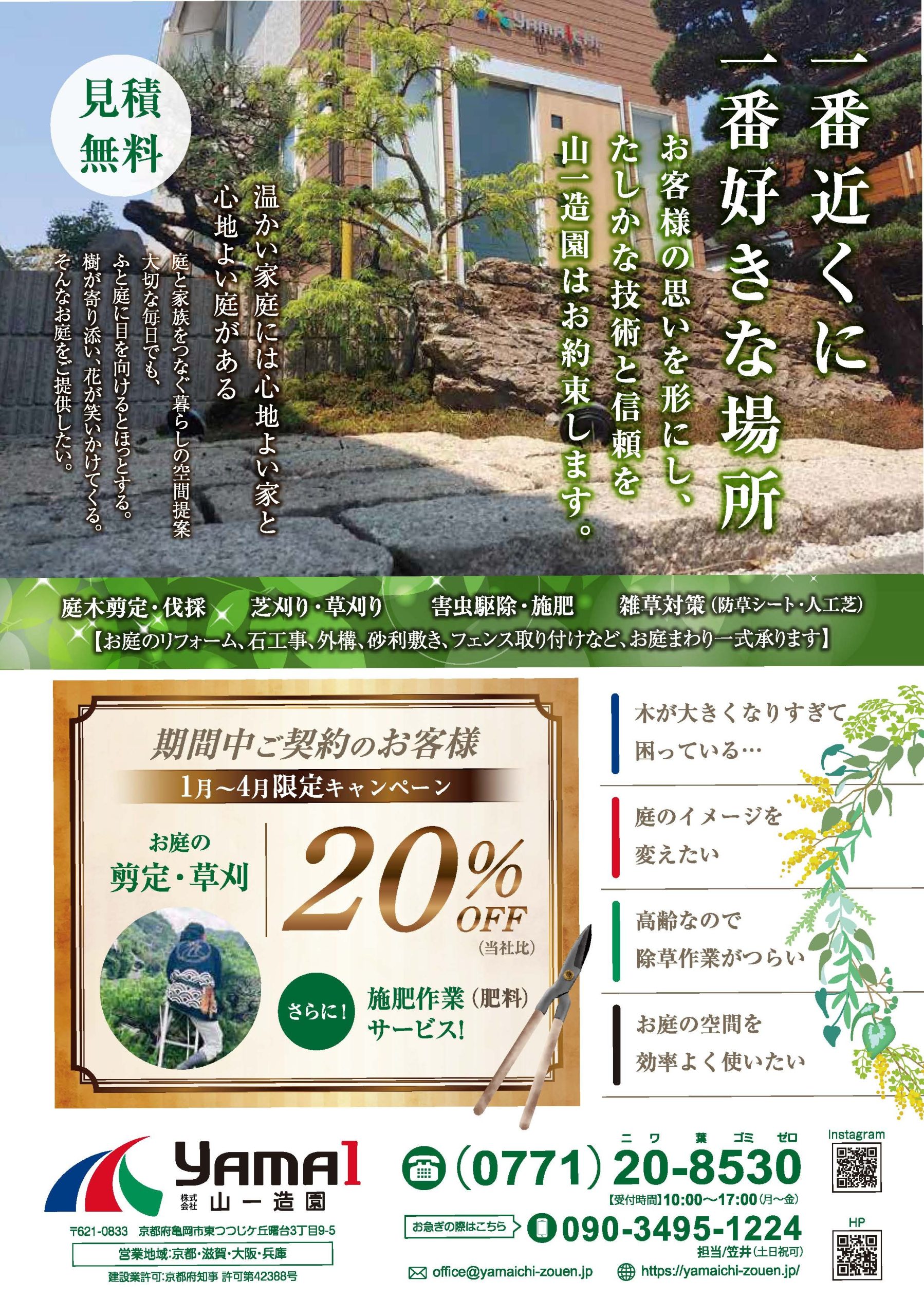 好評だったキャンペーンが帰ってきました! ~お庭の剪定・草刈にお困りの方へ~ 1月〜4月までにご契約いただいたお客様限定で、 お庭の剪定・草刈 20%OFF(当社比) さらに! 施肥作業(肥料)を無料サービス! お得にご利用いただける今がチャンスです!
